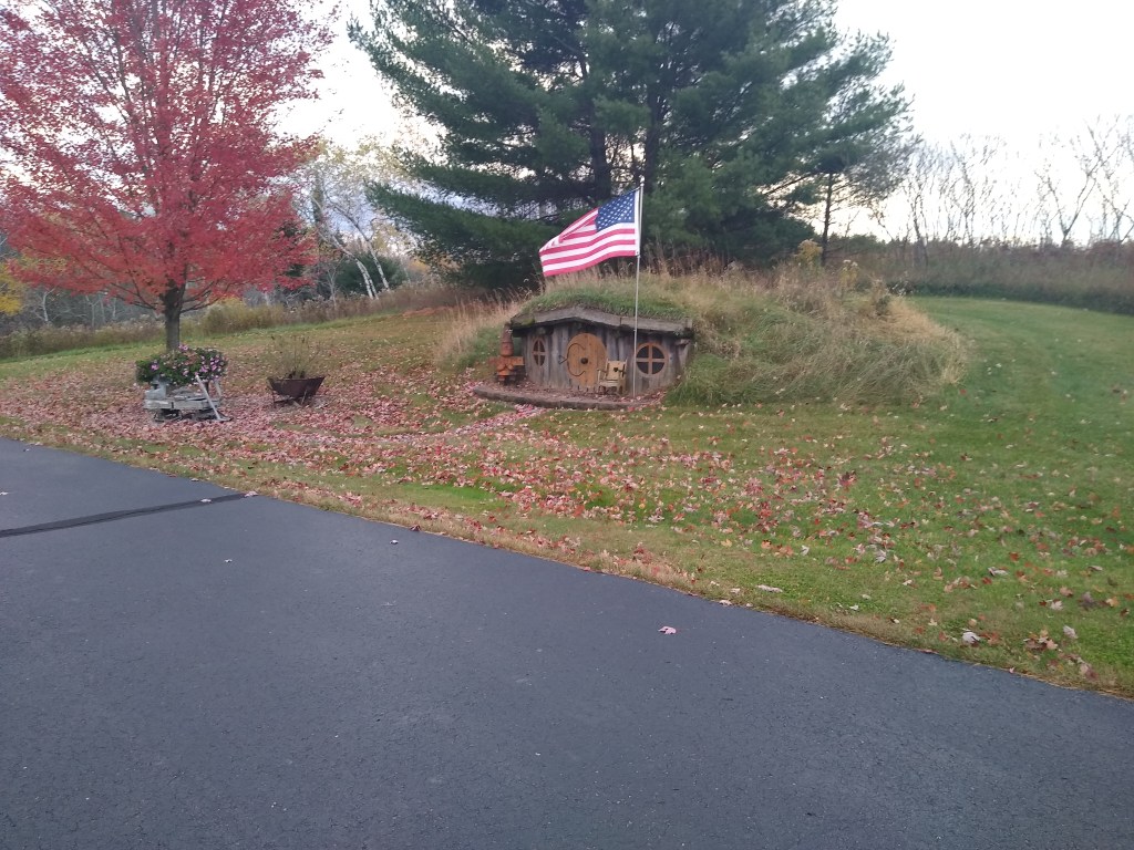 A staple of most Wisconsin farms is the small hut near the roadside for kids to wait for the school bus. As I approached a farm early in my hike, I saw what is pictured above. From a distance, it looked to be a hut built into the earth. This didn’t seem ridiculous at all to me; I had seen huts built into hills in both Europe and Iceland. Only when I got closer did it become clear that this was a facade. No hut, no elves or other little people. Somebody had a sense of humor and some spare time.