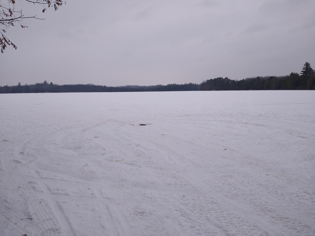 The longest section of my hike, 5.5 miles, was just west of a chain of lakes – Island, McCann, Clear and Chain Lakes. While we didn’t see any more animals, we saw plenty of tracks. One of the distinct advantages of hiking in the winter is seeing those tracks and appreciating all the life that had crossed our paths. As we walked south, we admired all the lakeside properties, gazed at the ice fishermen, and had lengthy conversations to pass the time and make the miles go more quickly. We kept ourselves occupied until we reached our next reference point, the parking lot and boat launch at Round Lake County Park. Barb then drove me back to the Backwoods Bar & Grill to pick up my car. Then we returned to Round Lake County Park.