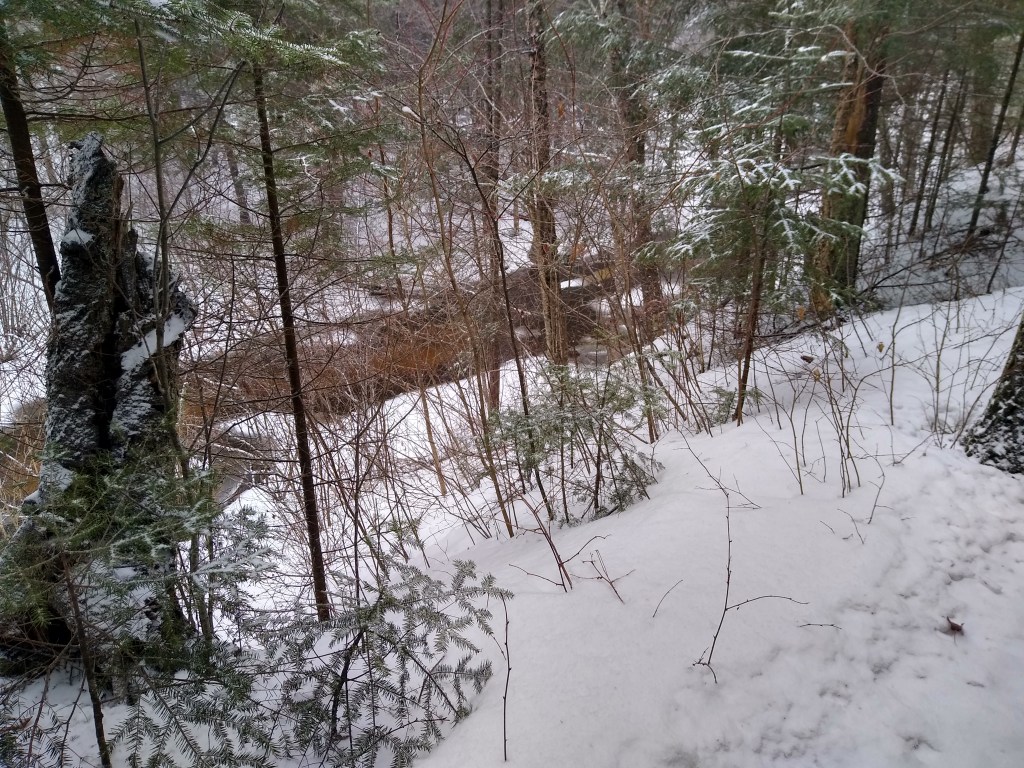 My guide DID speak to ponding after periods of rain. Between yesterday’s rain and the snow melt, there was a bumper crop of ponds along the trail. One of the worst sections was just north of that last crossing of Hemlock Creek. The trail was fairly wide and straight at this point – I’m guessing it was an ATV trail at some time. On this day, it might as well have been a canal. At its deepest, the water was at least half a foot deep. Sometimes, I could see a pond coming and try to go around it. At other times, the day’s new snow hid the ponds, so I would be trudging along what I thought was solid snow when – surprise!! – I was standing in a small lake. For a while, I tried to guess where the ponds were in an effort to stay relatively dry. Ultimately, I decided it was useless – I was going to get wet no matter what. So I just forged ahead through the slop.