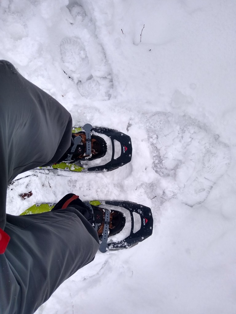 After Wednesday’s hike, I decided to bring my snowshoes in case I encountered similar trail conditions. After about a mile, I decided it was time to strap them on. On the plus side, they probably saved me a lot of post holing. Where there was ice, their teeth bit into it to give me more controls on hills.