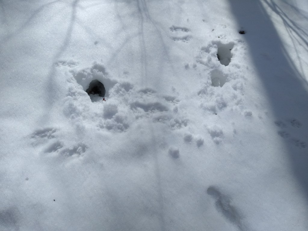 By mid-morning the snow ended, and the skies cleared. The rest of my hike would be under bright sunlight and brilliant blue skies. As I plugged along, I was reminded of one of winter hiking’s advantages – the tracks left by the many forest animals. One simply doesn’t appreciate how many creatures share the woods until it snows. Sometimes the tracks tell interesting stories, like the tracks below. What caused these little ones to scurry to their respective escape hatches?