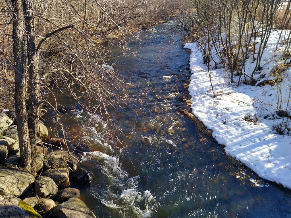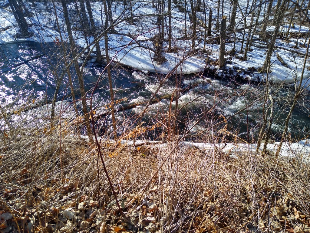 After this introduction to the creek, the trail ascended a bit before bending to the right and descending into some marsh land. The creek was to my left, glistening in brilliant sunshine. In the distance, I could see two white swans swimming. The trail began to rise again as I climbed a bluff on the creek’s north side. A beaver dam slowed it down a bit, but it still was running very fast. I kept climbing the bluff, which featured many switchbacks. Thank goodness for those mini-spikes! Finally, I reached the top, sat on a bench, and enjoyed the view you are seeing at the top of this post.