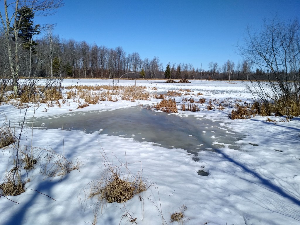 That brought up my second challenge – footwear. Although I had brought my snow shoes, I opted for mini-spikes to open the hike. I guessed, correctly, that all that slushy snow and ponding would be frozen solid. My mini-spikes bit right into that ice. As a result, I could negotiate the hills much more confidently, whether ascending or descending. It was truly liberating after all the slipping and sliding I had been doing.