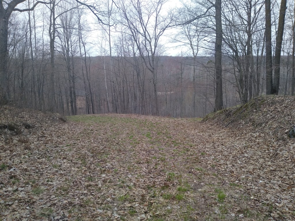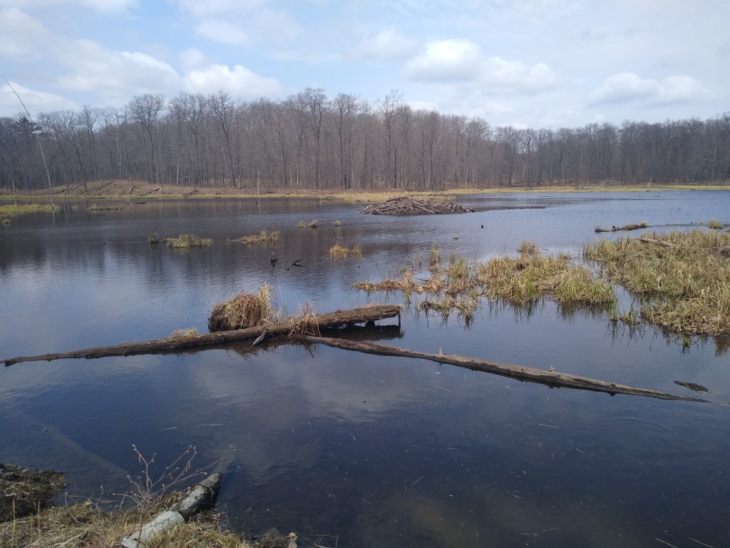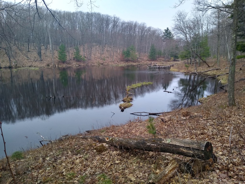 The trail immediately plunged into deep forest. Within a couple of miles, the pathway widened and got progressively more hilly. The section in the picture just above offered a majestic view of a series of lakes and beaver ponds before plunging downhill, turning left and running alongside the lakes and ponds.