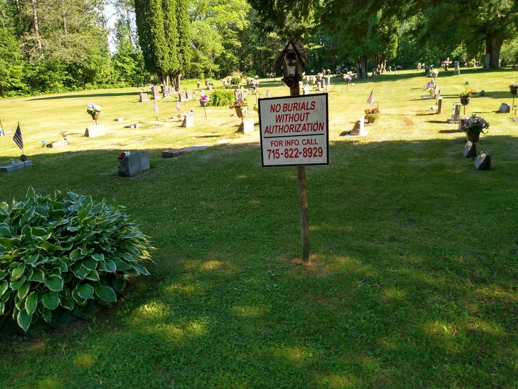 And so I was off. After crossing Wisconsin 63, I passed a small church cemetery, the postage stamp-sized burial area you see often when out in the country. Near the gate, I saw this sign.
