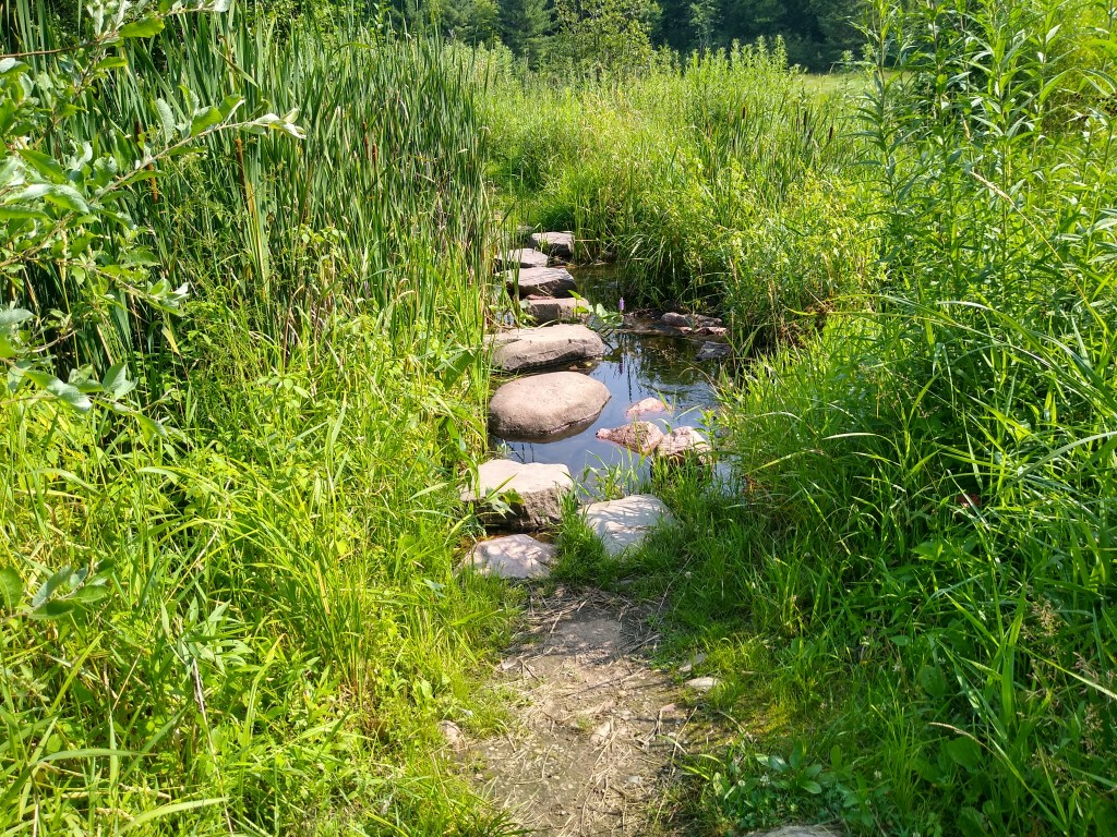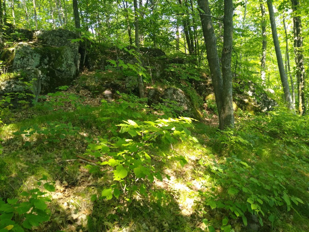 As I approached the final portion of the segment, the terrain changed again. Quite suddenly, the canopy opened into a meadow that ended at 140th Street. No more rocks. I was in the open now, and the midday sun was really frying me. I turned north and walked north on 140th Street for 0.4 of a mile before making a quick left turn into a stand of pines. The last 1.3 miles of trail took me into an area that is part of the Trade River Cross Country Ski Area in the winter months: gently rolling country that varied between being open to under a forest canopy. I was grateful to emerge from the woods to find my car waiting for me. I had been on the trails for three days in high heat, and I was beat!