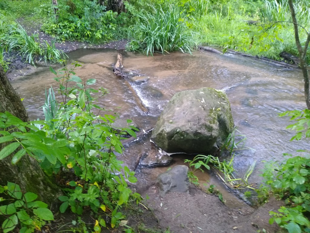 I looked upon the initial two mile stretch of rail along the St. Croix River as the “wild” portion of the hike, and I expected the sections closer to town to be somewhat urbanized, sort of like the Sturgeon Bay Segment( I was to learn later that I was mistaken.). A highlight for me was crossing Big Rock Creek. When the conditions are more dry, hikers can cross by rock hopping. Because of the storms, the creek was running high and fast, and I had to ford it. After taking unnecessary chances with my phone and key fob at Grassy Lake, this time I took the safe move of putting them in a plastic bag and stowing them in the top most pocket of my back pack. Then I removed my shoes and socks, rolled up my pants and waded across the 8-12 foot wide creek.
