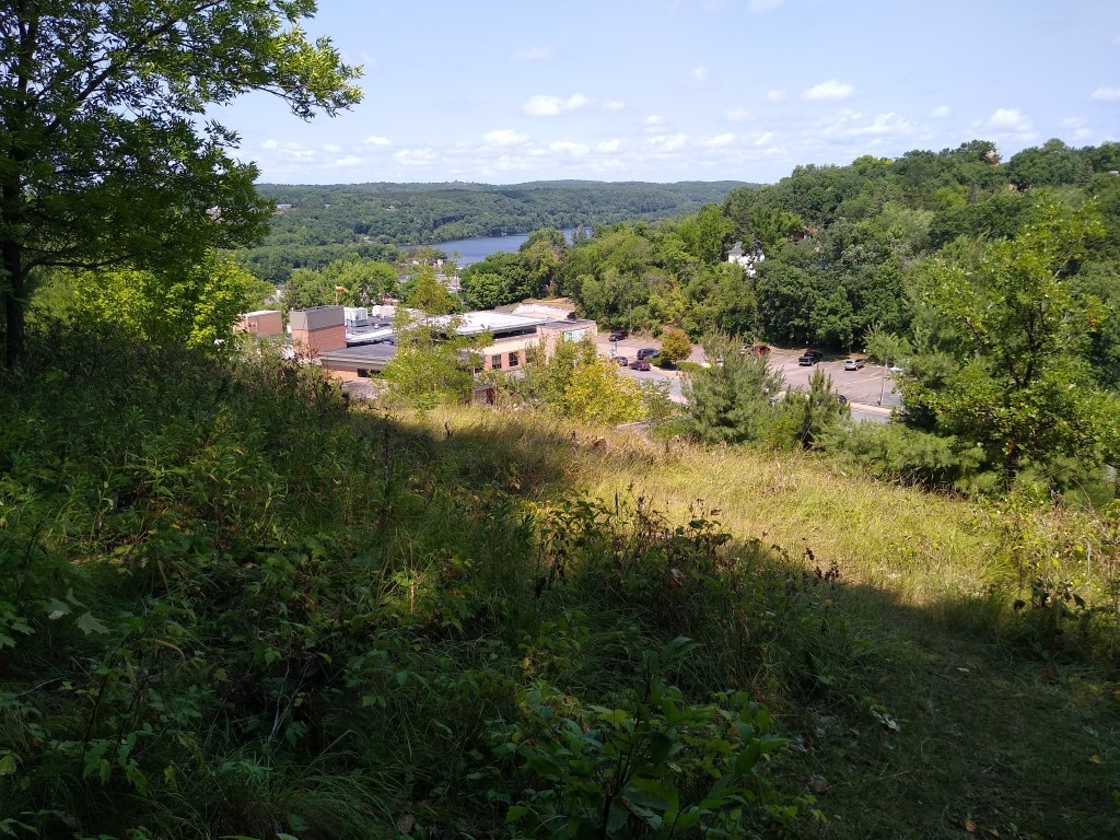 After Riegel Park, I crossed a street called Blanding Woods road. Now I knew I was entering St. Croix Falls, and I felt I was leaving the forested areas of trail behind me until I entered Interstate State Park. After taking a break with Jane and attending to a blister on my foot, I continued what I believed would be an urban hike. I was so convinced that I almost missed a very discreet sign showing the way up an extremely steep hill. The trail was more something I climbed up instead of walked on. I was ascending the last in-town “segment”, the Hospital Esker. Once I made it to the top, I was rewarded with several wonderful views of the town and the river valley. After a good half mile walk on top of the esker, I descended to Wisconsin Highway 35. Soon I reached the entrance to Interstate State Park.
